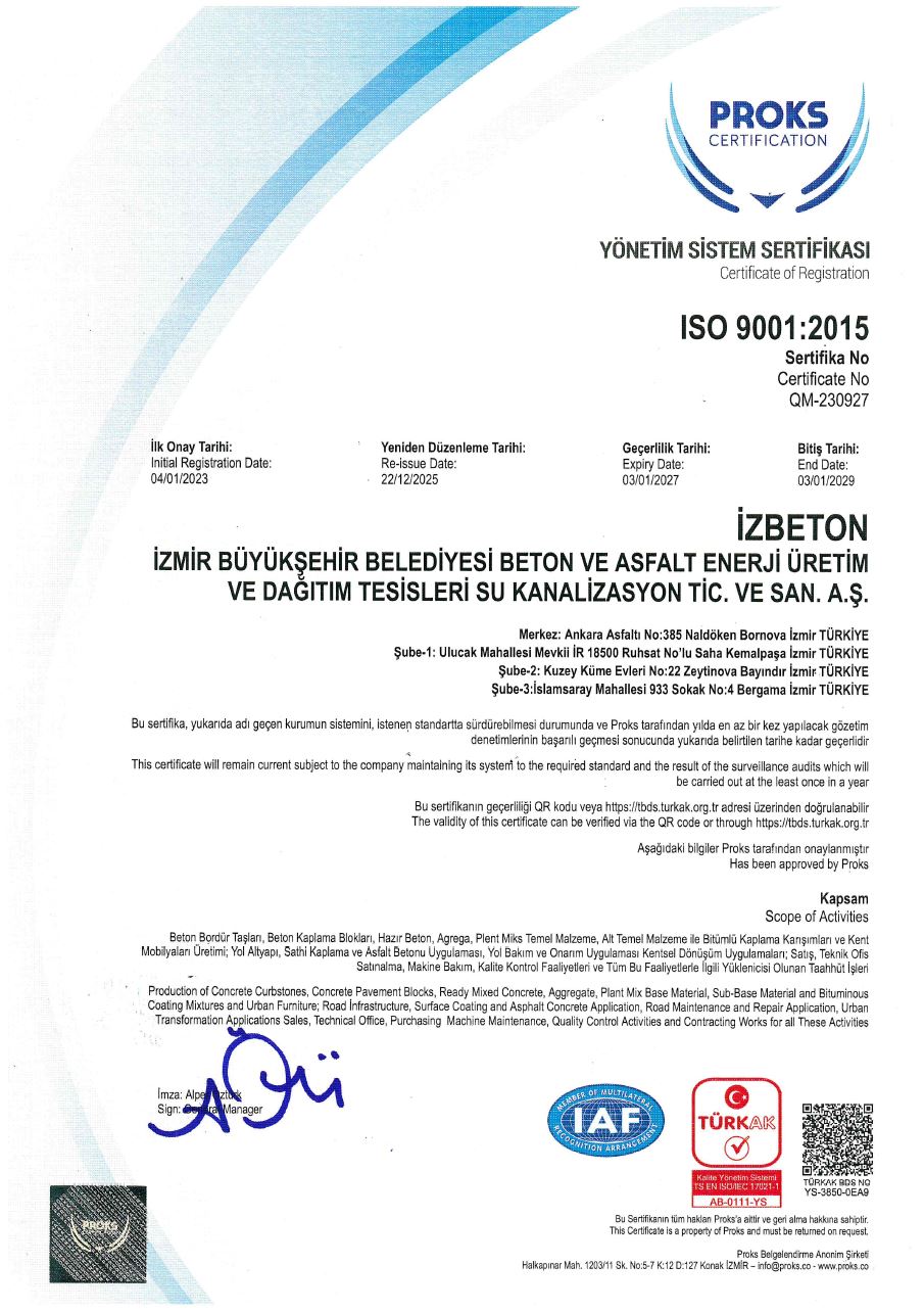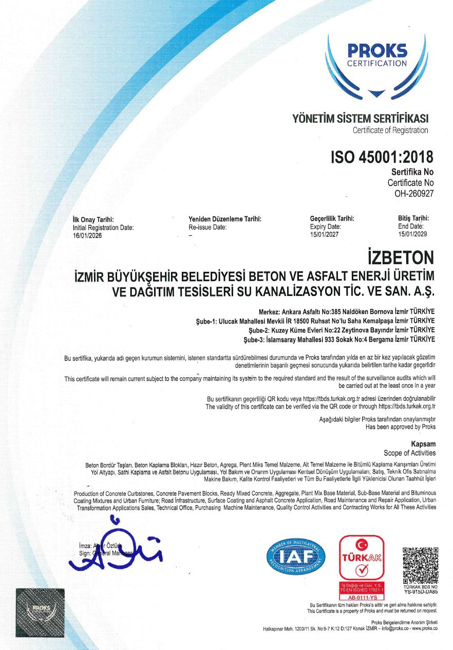 İzmir Büyükşehir Belediyesi İZBETON A.Ş. olarak, tüm çalışma alanlarımız ve taahhüdümüz altındaki projelerimizin gerçekleştirilmesinde, sürekli ve kalıcı başarının; Kalite, Çevre, İş Sağlığı ve Güvenliği Yönetim sistemlerinin uygulanması, sürdürülmesi ve sürekli iyileştirilmesi ile sağlanacağına inanıyoruz.